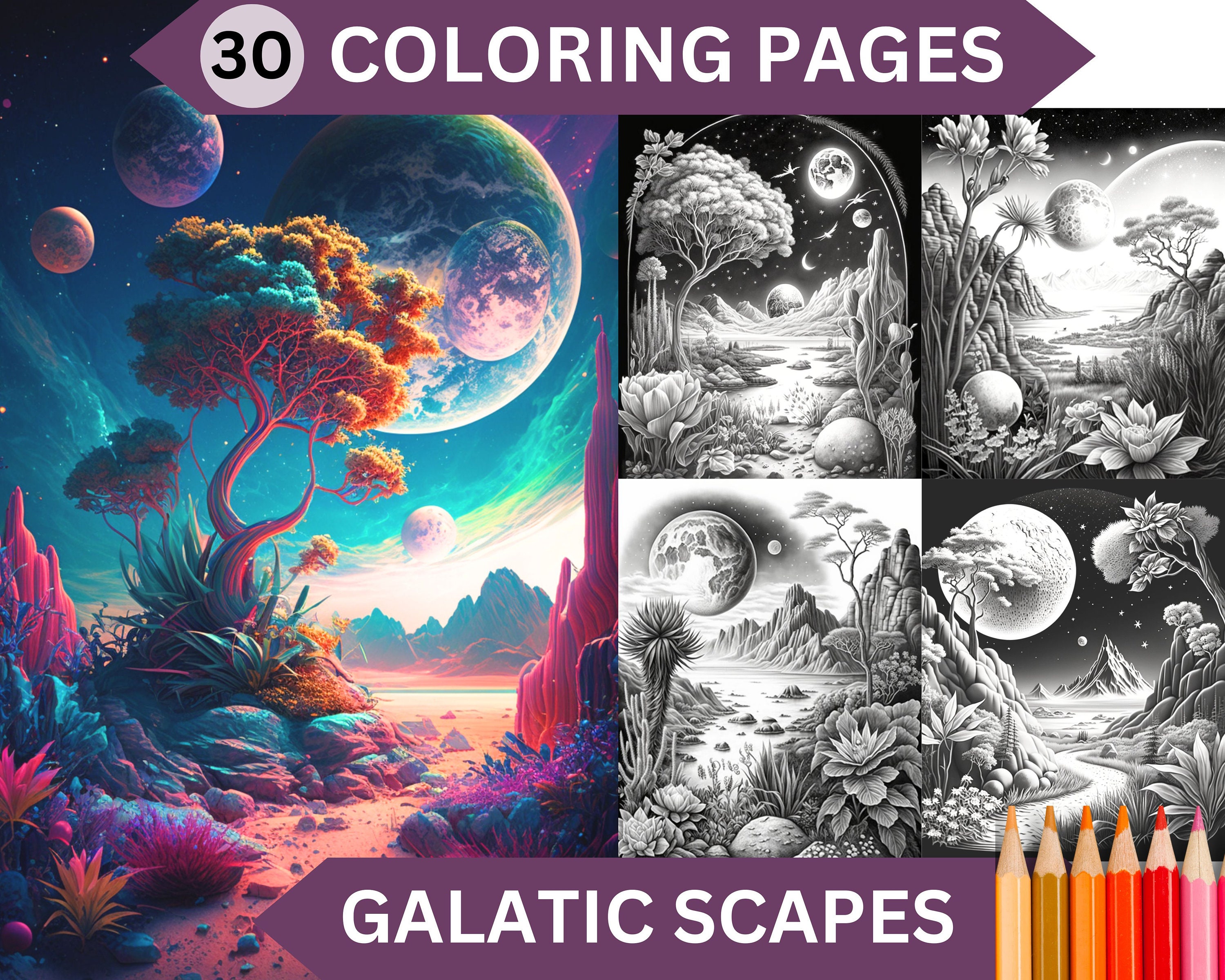 30 Galactic Scapes Coloring Pages Printable Adult Grayscale Etsy